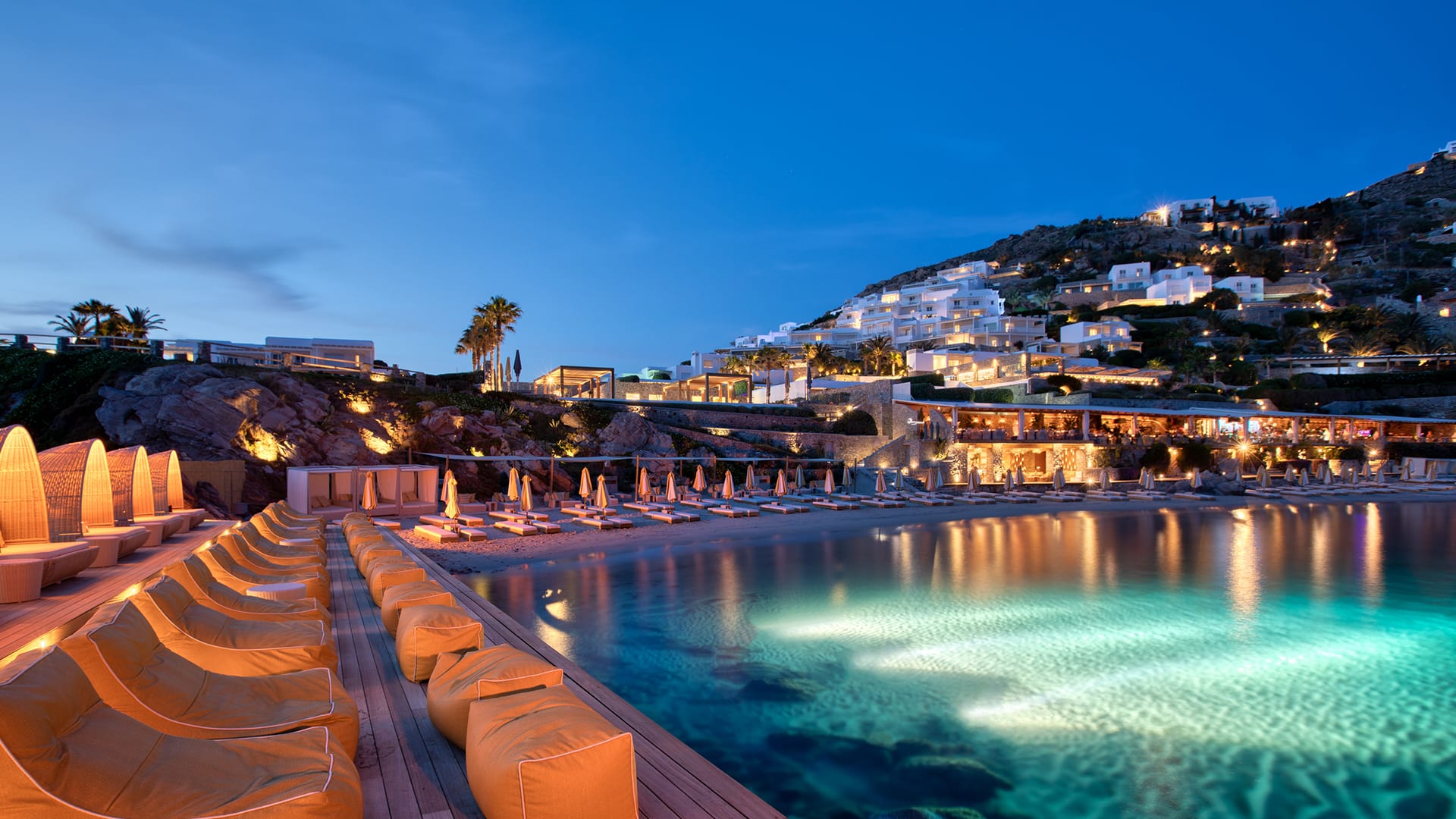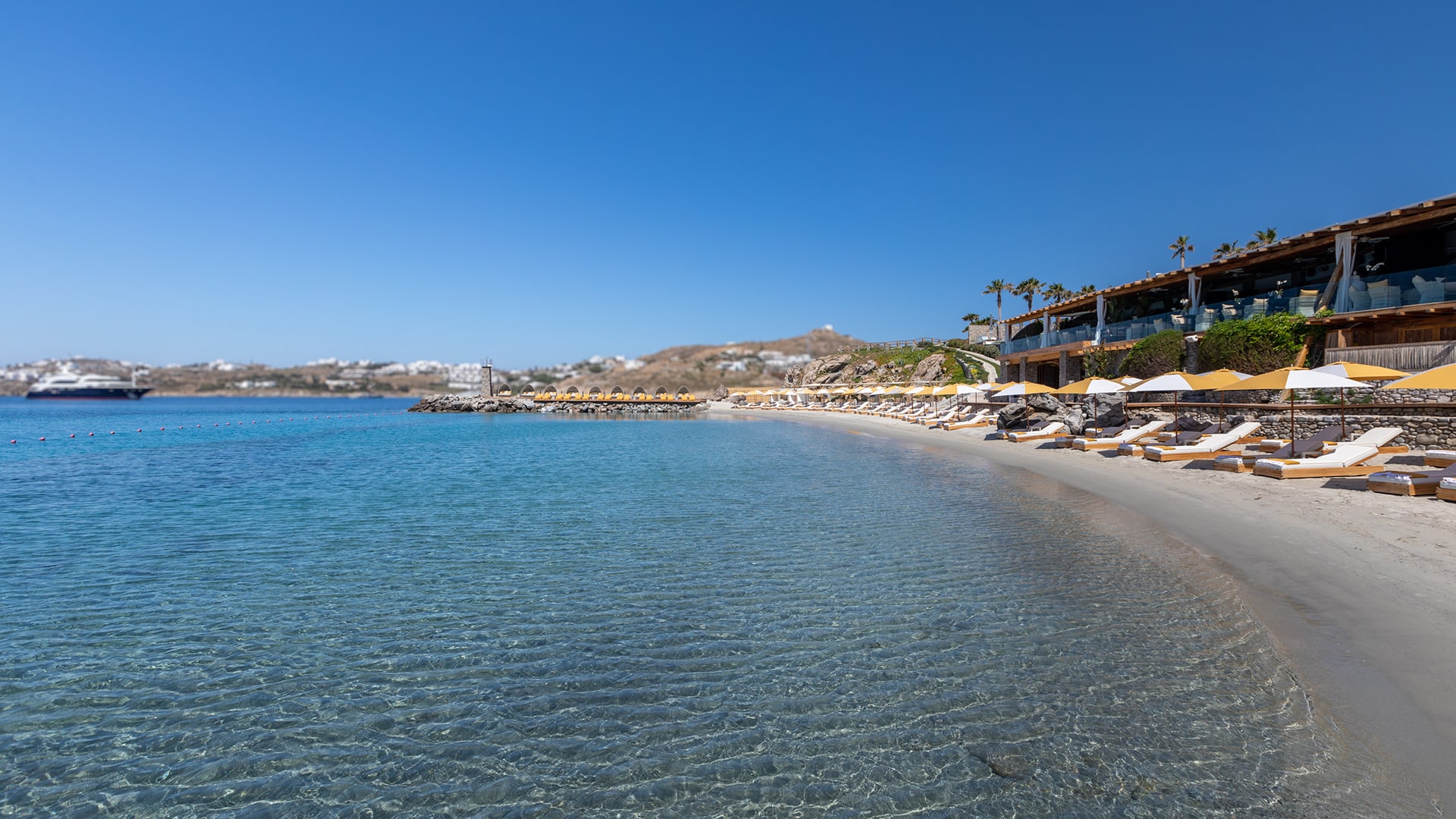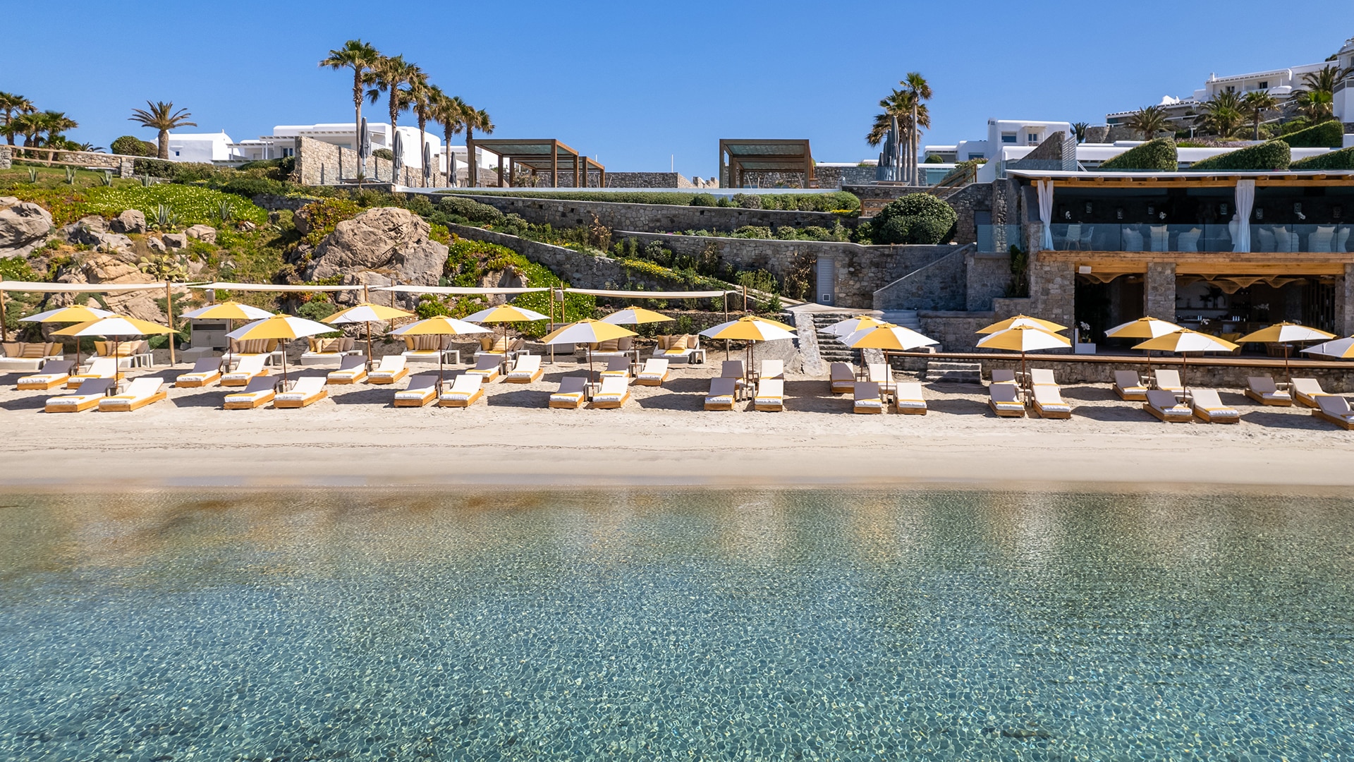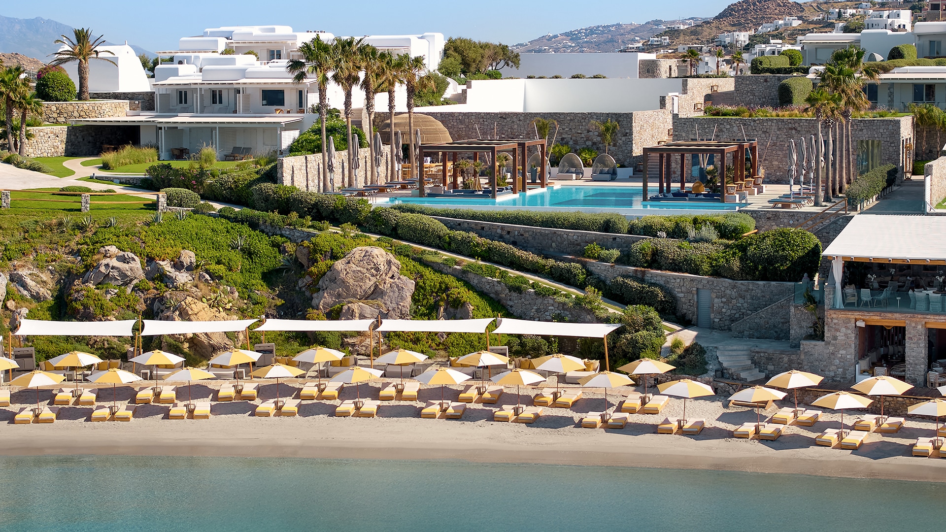 When you think about us, you can feel the sun on your back and the sand on your toes, offering an unrivalled sanctuary where you can swim and sunbathe in blissful seclusion at the edge of the blue Aegean, on a resort beach set apart. Nestled in a quiet cove and protected from the famed Mykonian winds, this curve of golden sand slopes gradually into crystal clear waters. Take life at your own pace: relax in the shade and let us indulge.