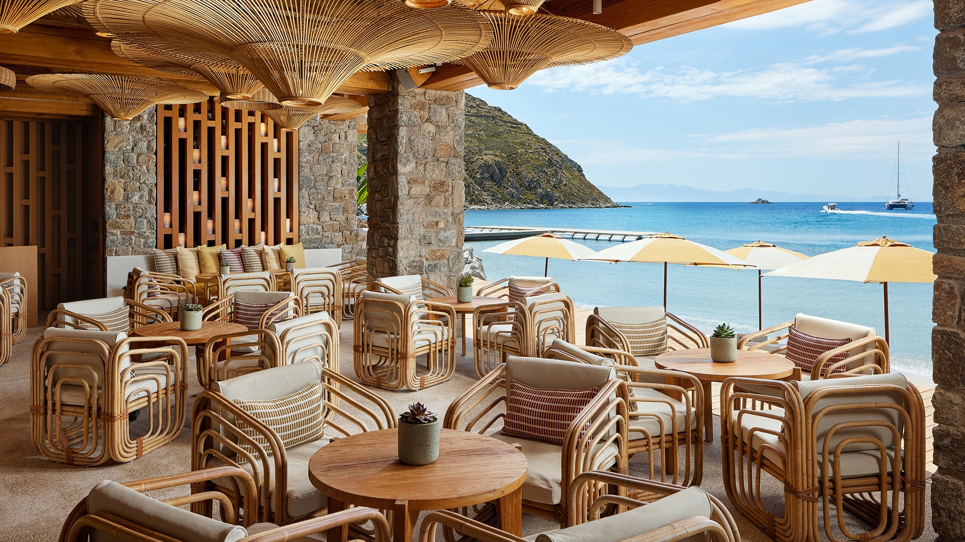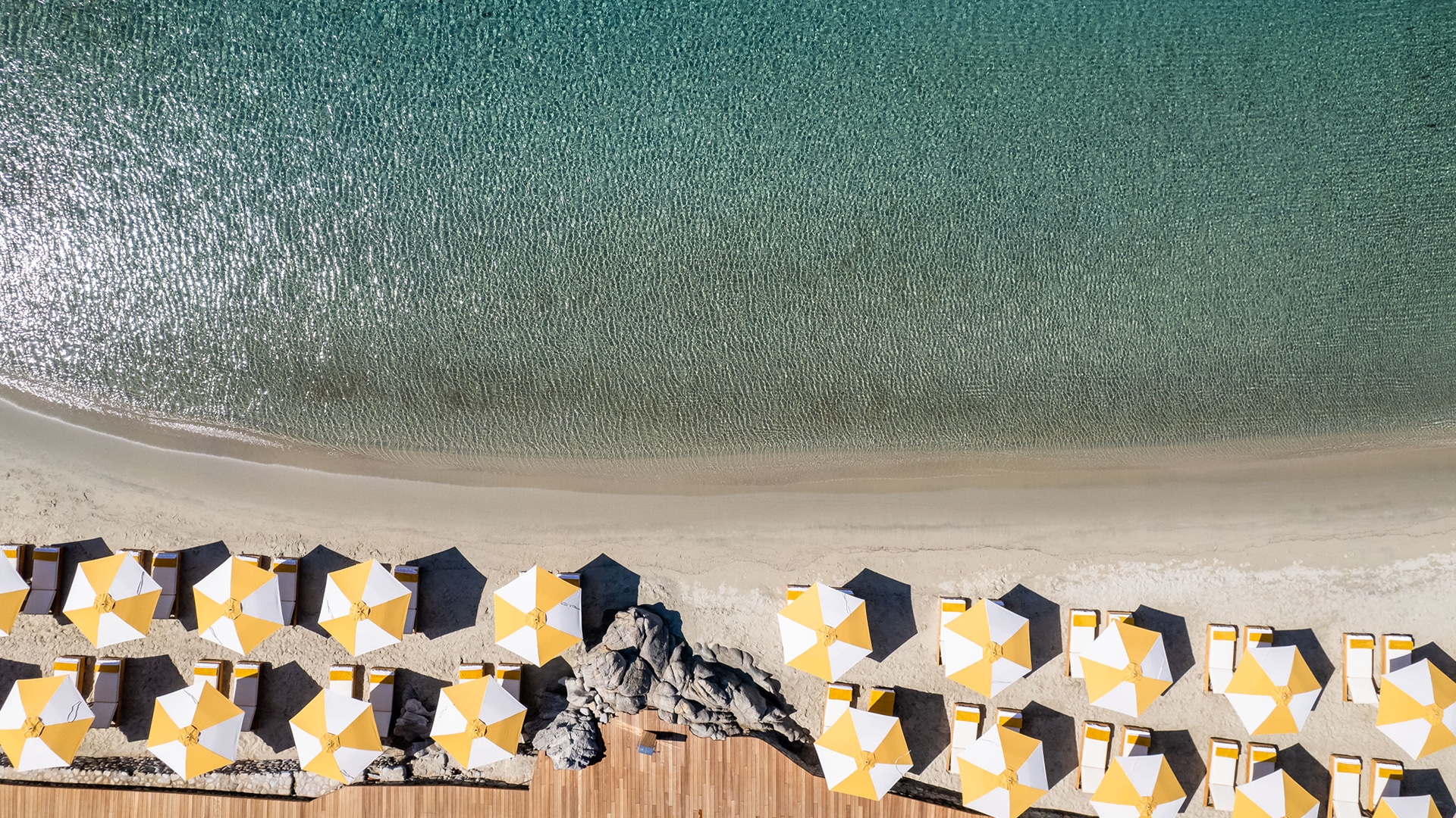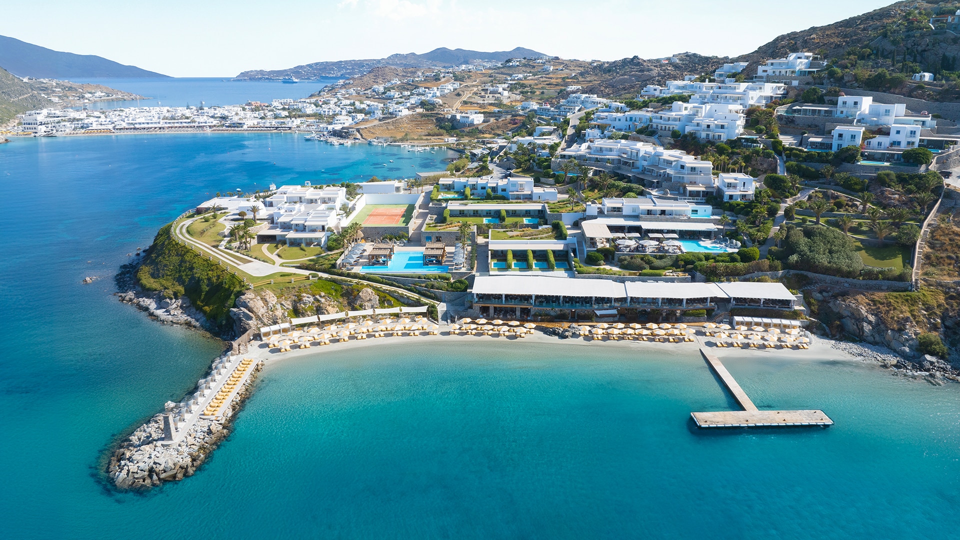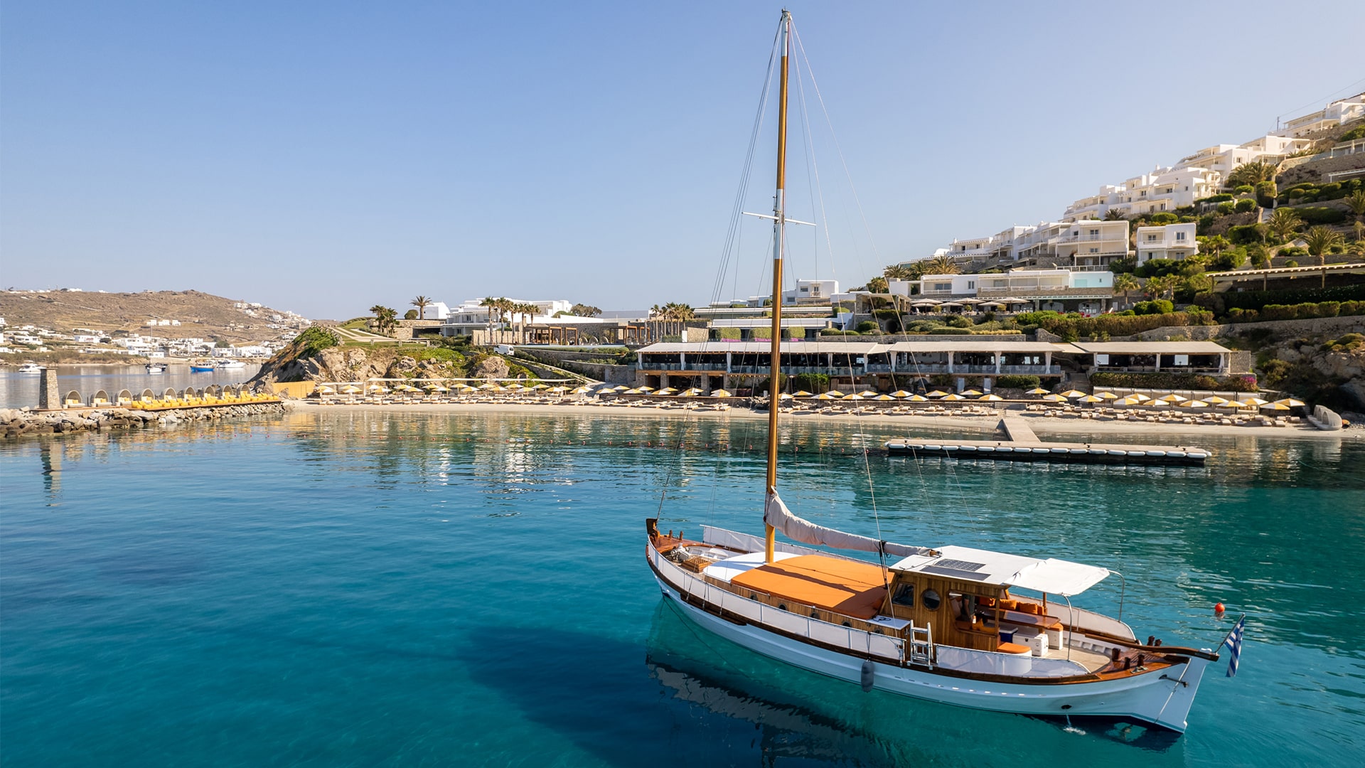 When you think about us, you can feel the sun on your back and the sand on your toes, offering an unrivalled sanctuary where you can swim and sunbathe in blissful seclusion at the edge of the blue Aegean, on a resort beach set apart. Nestled in a quiet cove and protected from the famed Mykonian winds, this curve of golden sand slopes gradually into crystal clear waters. Take life at your own pace: relax in the shade and let us indulge.